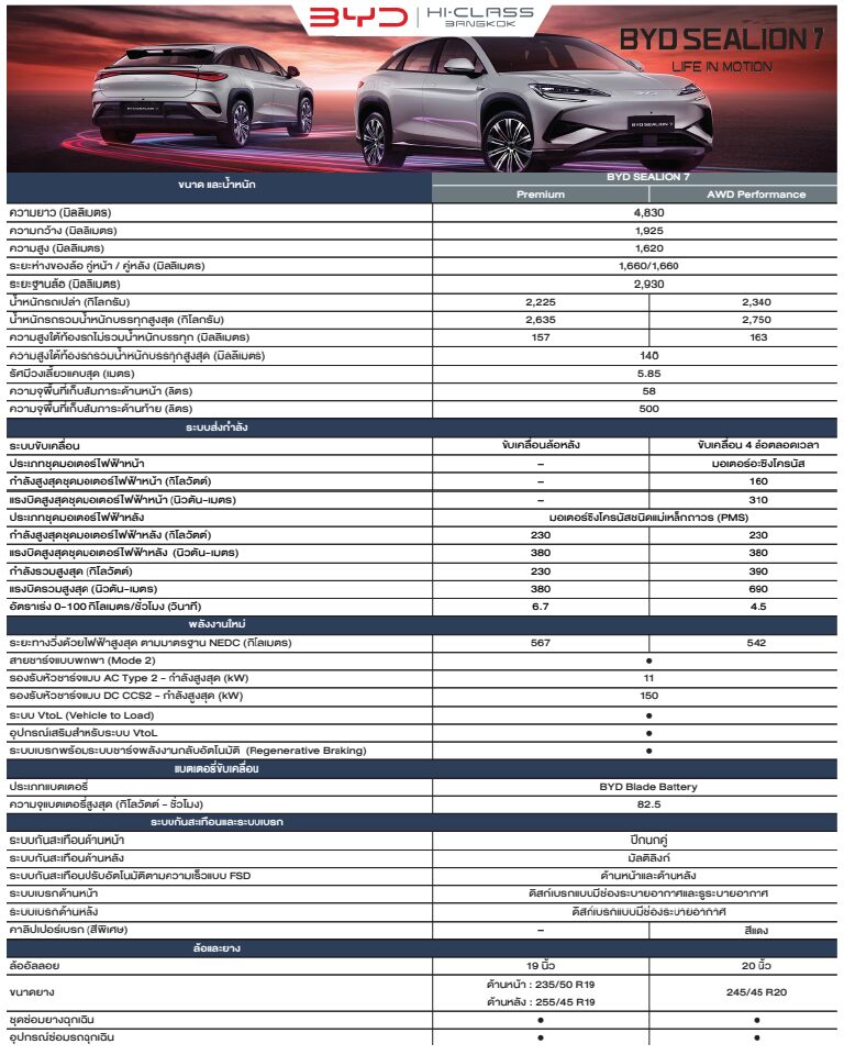 BYD SEALION 7 รถไฟฟ้า C-SUV ดีไซน์สปอร์ตผสานความพรีเมียมได้อย่างลงตัว BYD SEALION 7 รุ่น Premium